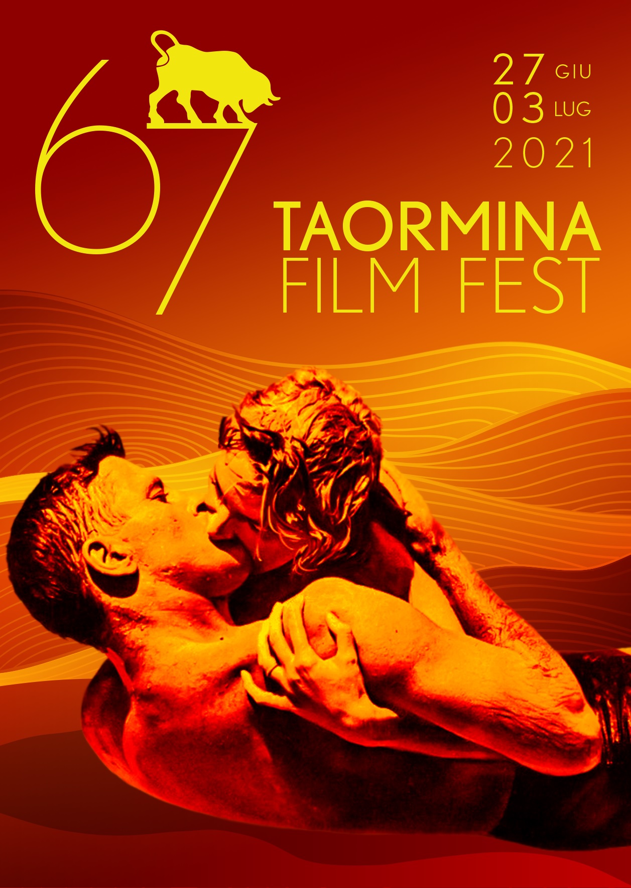 È un omaggio al film Da qui all’eternità (From Here to Eternity) di Fred Zinnemann il manifesto ufficiale della 67ma edizione del Taormina Film Fest che accenderà i riflettori del Teatro Antico sul grande cinema dal 27 Giugno al 3 Luglio. Rivisitazione stilizzata in chiave moderna, con una scelta cromatica più calda e luminosa, di una delle sequenze più intense e sensuali nella storia del cinema, il manifesto è stato realizzato da Ginevra Chiechio su una palette di colori ispirati alla luce e al calore di Taormina per reinterpretare l’iconica scena del bacio sulla spiaggia fra Deborah Kerr e Burt Lancaster.