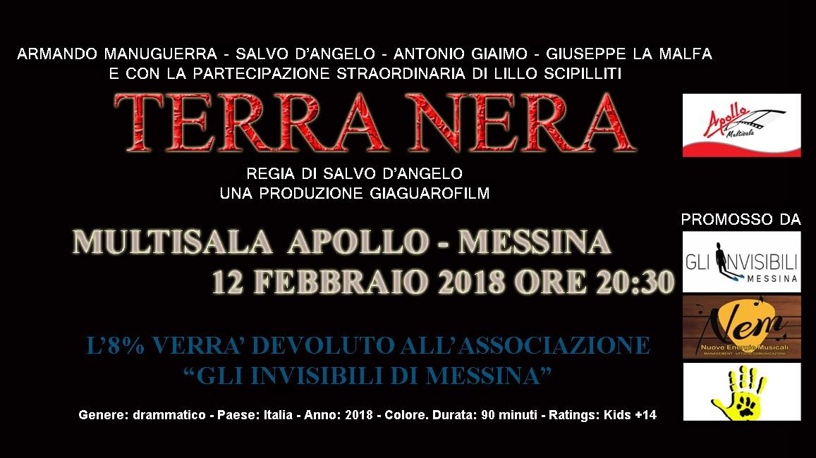 TERRA NERA è promosso da “Impronte”, in collaborazione con il cinema “Multisala Apollo”, l’Associazione “Nem- Nuove energie musicali e l’Associazione “Gli Invisibili” di Messina (alla quale verrà devoluto l’8% dell’incasso). Già, si registra il tutto esaurito per la prima prevista il 12 febbraio alle ore 20.30.
