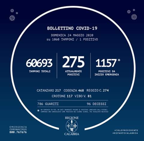 Tuttavia il dato cumulativo regionale dei casi confermati, nonché quello di Reggio Calabria, rimangono invariati in quanto è stato verificato definitivamente come negativo (su due tamponi di controllo) un caso positivo di Polistena del 20 maggio, che era stato ritestato per un supposto problema tecnico.