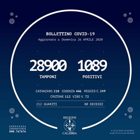In Calabria ad oggi sono stati effettuati 28.900 tamponi. Le persone risultate positive al Coronavirus sono 1.089 (+1 rispetto a ieri), quelle negative sono 27.811.