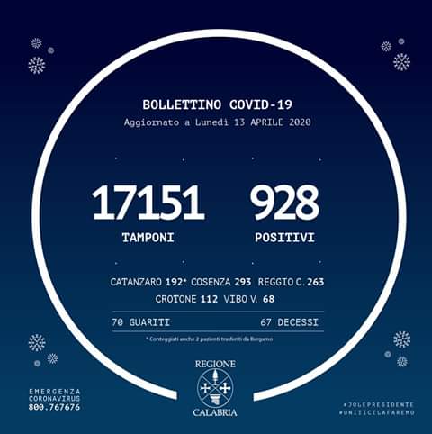 17.151, sono i tamponi che fino ad oggi 13 aprile 2020 le Autorita’ sanitarie hanno prelevato in Calabria dall’inizio dell’infezione da #Coronavirus