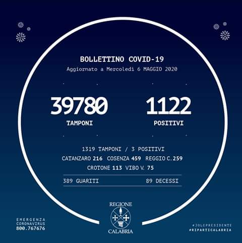 In Calabria ad oggi sono stati effettuati 39.780 tamponi. Le persone risultate positive al Coronavirus sono 1.122 (+3 rispetto a ieri), quelle negative sono 38.658.