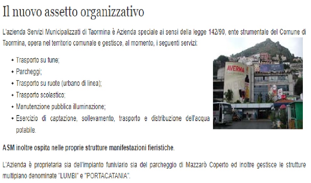 L’Azienda Servizi Municipalizzati di Taormina è Azienda speciale, opera nel territorio comunale e gestisce, al momento, i seguenti servizi: “funivia; parcheggi; trasporto urbano di linea; trasporto scolastico; manutenzione pubblica illuminazione; esercizio di captazione, sollevamento, trasporto e distribuzione dell’acqua potabile”.