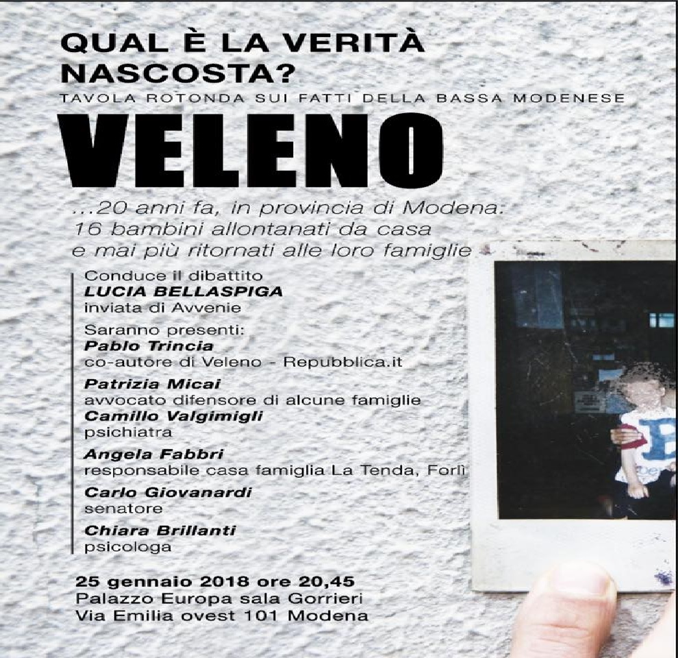Giovedì 25 gennaio, alle ore 20.45 a Modena presso la Sala Gorrieri di Palazzo Europa, si terrà una tavola rotonda sui fatti della Bassa modenese; un evento dal titolo: “Qual è la verità nascosta? – Veleno”. Venti anni fa, in provincia di Modena, 16 bambini allontanati da casa e mai ritornati in famiglia”.
