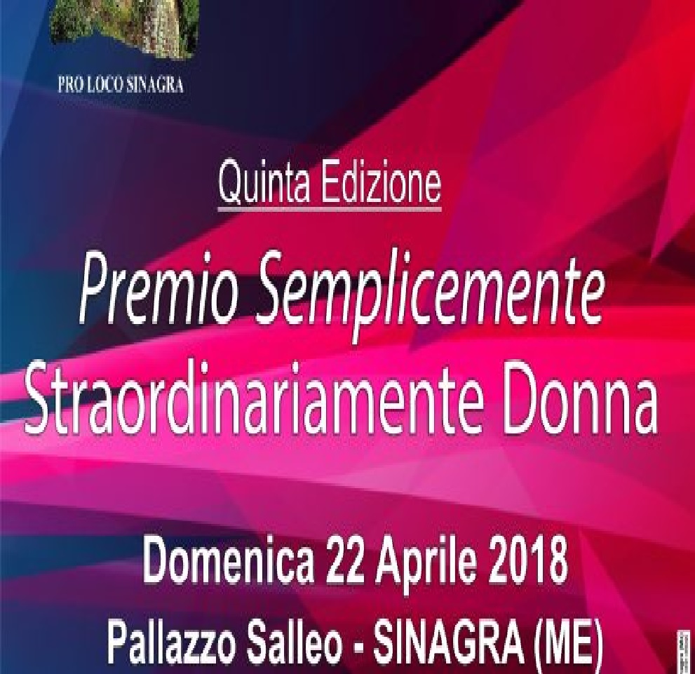 Sinagra (Messina) – Torna il premio biennale -Semplicemente, Straordinariamente Donna-, organizzato dalla Proloco di Sinagra, l’Associazione presieduta da Enza Mola, è giunto quest’anno alla Quinta edizione. Tutto pronto dunque per la cerimonia di consegna che si terrà domenica 22 Aprile 2018 con inizio alle ore 18.00 nel salone di rappresentanza di Palazzo Salleo a Sinagra. A ritirare l’ambito riconoscimento, per l’alto profilo personale e professionale, tre donne che rappresentano davvero l’eccellenza in ambito regionale e nazionale.
