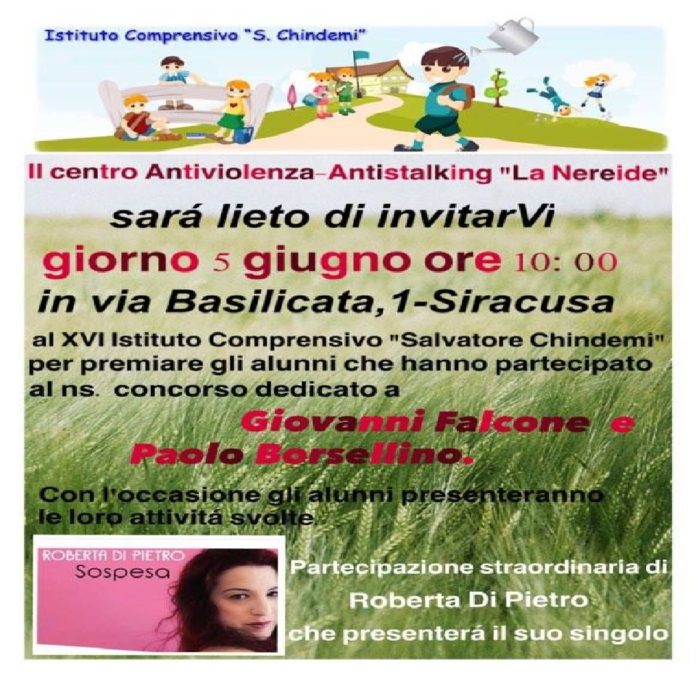 In una nota, i responsabili del Centro Antiviolenza-Antistalking “La Nereide” specificano, che lo stesso sarà lieto di invitare quanti lo volessero, giorno 5 giugno ore 10 in via Basilicata, 1 – Siracusa al XVI° Istituto Comprensivo “Salvatore Chindemi.