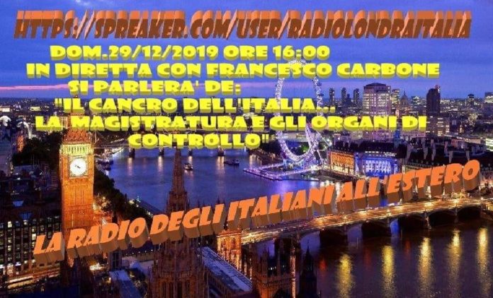 Alle 16:00, diretta con Radio Londra Italia: “Titolo dell’argomento… Il cancro dell’Italia… la Magistratura e gli organi di controllo”. Lo rende noto stamane, sulla sua pagina di Facebook Francesco Carbone, il presidente dell’Associazione di promozione sociale Governo del Popolo della Provincia di Palermo.