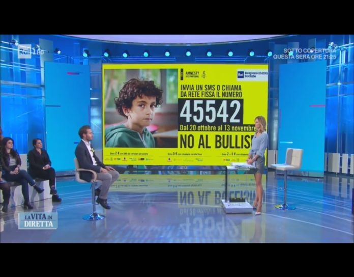 Questo pomeriggio, l’attore Giorgio Marchesi, è stato ospite a “La Vita in Diretta”, ed intervistato da Francesca Fialdini ha spiegato la campagna (valida fino al 13 novembre) di “Amnesty International” contro il “bullismo”, che rientra in una tipologia di reato definita “violazione dei diritti umani”.