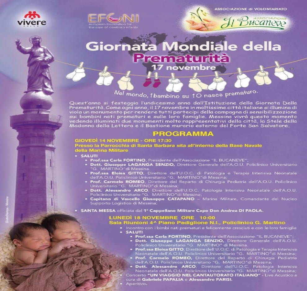 Il cosi detto follow-up neonatale e del neonato a Rischio che permette di riconoscere in modo tempestivo problematiche di tipo pediatrico e auxologico, sequele neurosensoriali o comportamentali a breve e/o a lungo termine del bambino pretermine o con gravi patologie neonatali. Esso, rappresenta inoltre, un collegamento tra i medici che hanno avuto in cura il bambino durante la degenza ed il pediatra curante, fornisce un sostegno alla famiglia nell’affrontare le problematiche del bambino dopo la dimissione,risponde alle esigenze dei genitori riguardo l’invio per consulenze psicologiche, invio in centri superspecialistici, disbrigo formalità per forniture protesiche, monitor, sonde alimentazione,aspiratori, ossigenoterapia. Spinta da questi obiettivi, l’Associazione Il Bucaneve, in collaborazione con le UO di Terapia Intensiva Neonatale e di Neonatologia dell’AOU G.Martino, in concomitanza della Giornata Mondiale del Prematuro, promossa dall’Associazione Italiana Vivere Onlus, che si festeggia giorno 17 novembre, ha il piacere di organizzare il seguente Programma che si articolerà nella giornata del 14, del 17 e del 18 novembre. Inoltre, come ogni anno moltissime città italiane illuminano di viola un monumento per rendere tutti partecipi della campagna di sensibilizzazione sui bambini nati prematuri e sulle loro famiglie, anche la nostra città di Messina, il 17 novembre, grazie al lavoro di tutti i volontari dell’Associazione, vivrà questo momento vedendo illuminati due monumenti molto rappresentativi della città: la Stele della Madonna della Lettera e il Bastione Murario esterno del Forte San Salvatore.