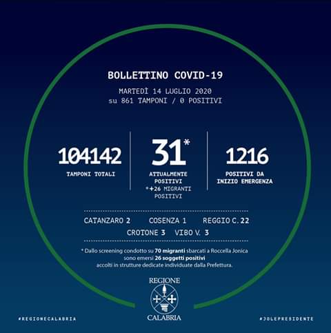 Anche oggi 14 luglio 2020, zero contagi per il Coronavirus in Calabria
