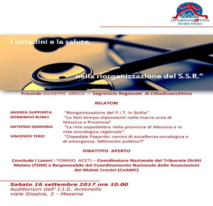 Angela Rizzo, in vista del convegno del 16 settembre prossimo che sarà tenuto dall’Associazione della quale fa parte, scrive: “è un momento importante, fortemente voluto da CittadinanzAttiva Sicilia, per riflettere sulla situazione della sanità regionale. Si doveva calare il decreto Balduzzi nella nostra realtà, con la maggior attenzione possibile alle esigenze delle collettività locali, invece il tutto è passato sulle nostre teste, senza che nessuno sentisse l’esigenza di consultare i cittadini o, quanto meno, i rappresentanti delle autonomie locali. Tra l’altro si sono cancellate due strutture ospedaliere che dovevano essere complementari, Milazzo e Barcellona, e si è tolto qualsiasi significativo ruolo all’ospedale Papardo.