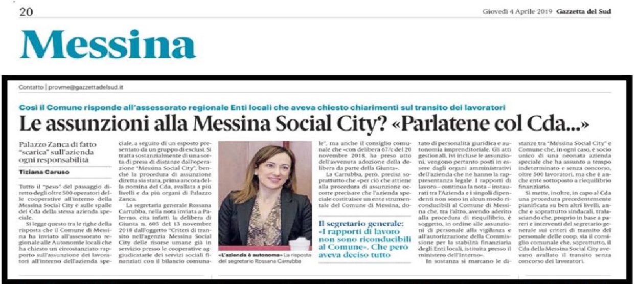 Angela Rizzo, esperta messinese del Settore dei Servizi Sociali, è intervenuta commentando le dichiarazioni della segretaria comunale di Palazzo Zanca, in riferimento alla nuova Agenzia Messina Social City e sottolinea: “come volevasi dimostrare, la Carrubba prende le distanze e scarica le responsabilità. I lavoratori ancora una volta -venduti e utilizzati-. Cosa dicono i -sindacati- amici del sindaco? E i -consiglieri comunali- che fanno?”.