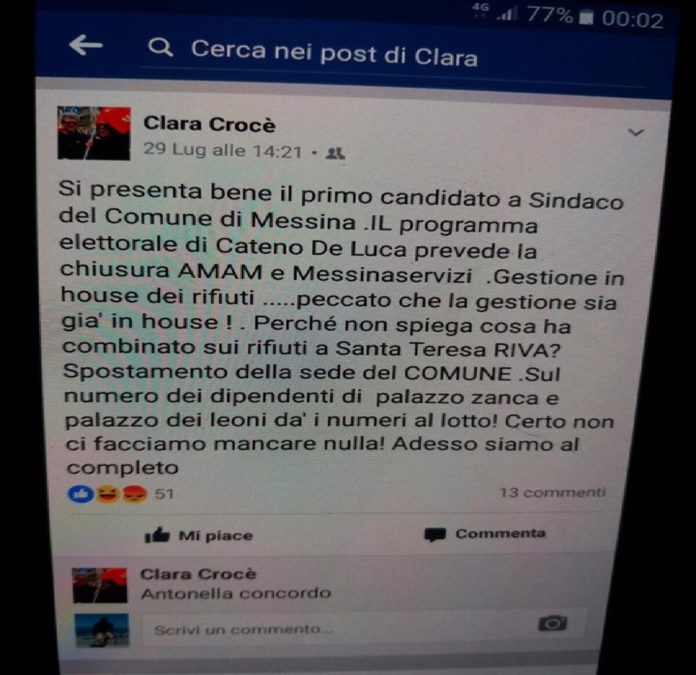 Una giornata (quella di ieri sabato 29 luglio), caratterizzata da un appuntamento preelettorale organizzato da “Sicilia Vera” e Cateno De Luca per lanciare ancor di più la candidatura a sindaco di Messina. Questa iniziativa, ha iniziato a suscitare in qualcuno stati d’animo contrari volti a contrastarla, come ad esempio ha fatto Clara Crocè (segretaria della Fp Cgil).