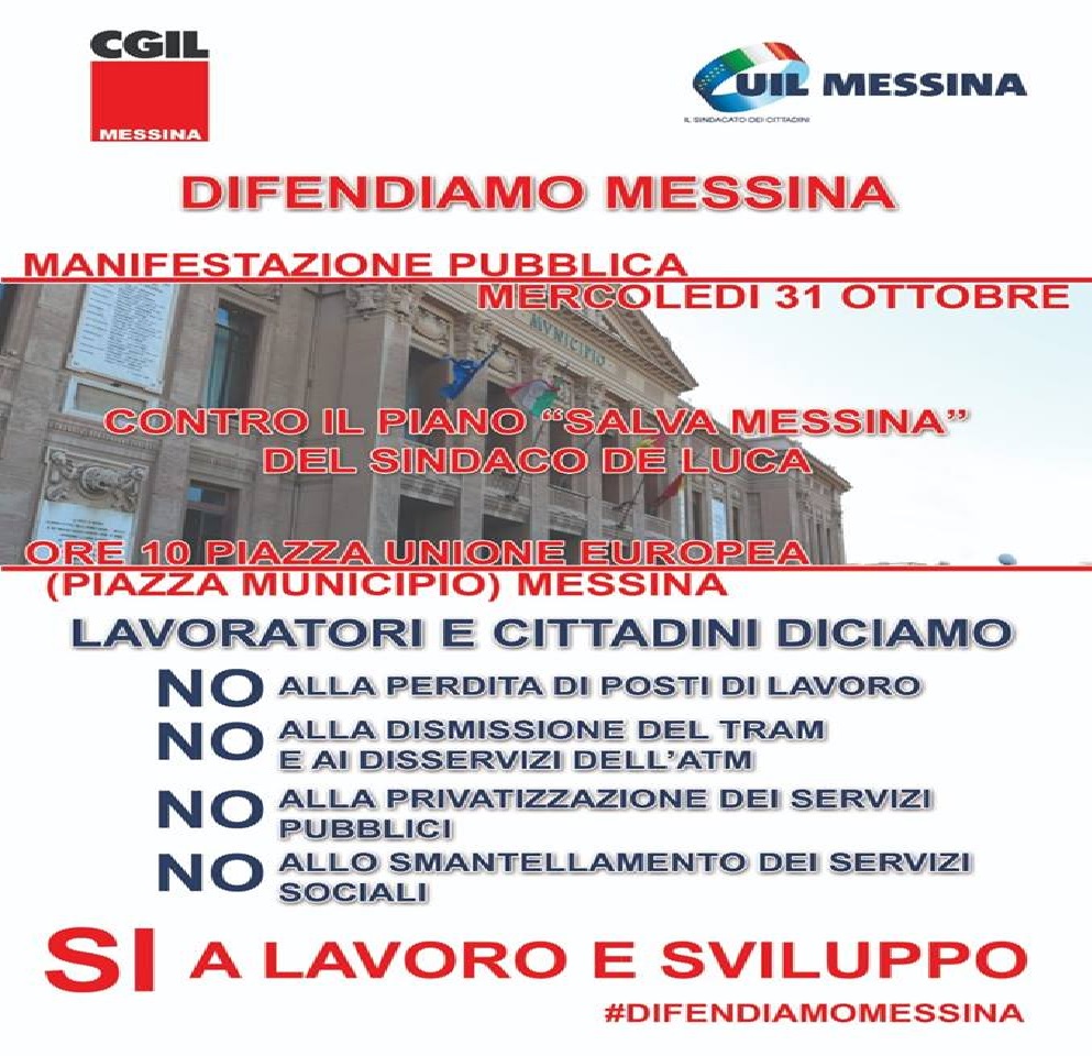 I responsabili dei due sindacati, scrivono: “Manifestazione pubblica mercoledì 31 ottobre contro il Piano Salva Messina del sindaco De Luca. Ore 10, piazza Unione Europea (piazza Municipio) Messina”.