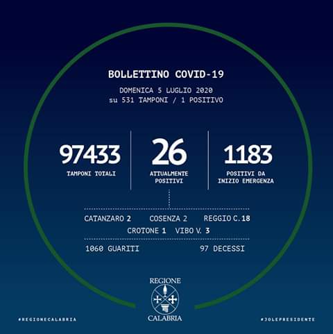 In Calabria ad oggi sono stati effettuati 97.433 tamponi. Le persone risultate positive al Coronavirus sono 1.183 (+0 rispetto a ieri), quelle negative sono 96.250.