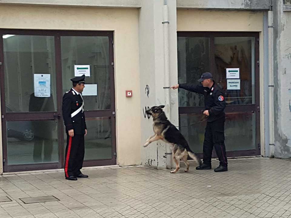I carabinieri con l’aiuto di unità cinofile “antidroga” del Nucleo Carabinieri Cinofili di Nicolosi, hanno controllato alcuni ambienti intorno all’istituto rinvenendo, in un’aiuola, una bustina con della marjuana, lanciata verosimilmente da qualche finestra.
