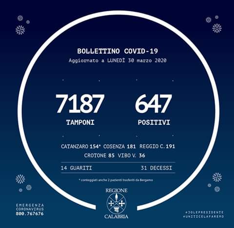 In Calabria ad oggi sono stati effettuati 7187 tamponi. Le persone risultate positive al Coronavirus sono 647 (+33 rispetto a ieri), quelle negative sono 6540.