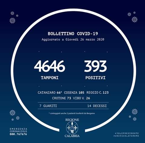 #Coronavirus il Bollettino regionale: in Calabria ad oggi sono stati effettuati 4646 tamponi”.