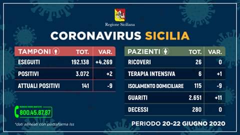 Questo il quadro riepilogativo della situazione nell’Isola negli ultimi tre giorni (20-22 giugno) e aggiornato alle ore 17 di oggi, in merito all’emergenza #Coronavirus, così come comunicato dalla Regione Siciliana all’Unità di crisi nazionale.