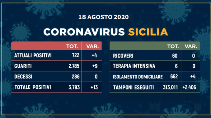 Oggi sono 13 i nuovi positivi in Sicilia, così ripartiti per provincia: 4 a Ragusa, 4 a Catania, 3 a Messina, 1 a Caltanissetta e 1 Enna. Aumento di 4 unità nel numero degli isolati domiciliari. I guariti sono 9: 7 a Catania e 2 a Ragusa. Nessuna variazione per gli altri dati.