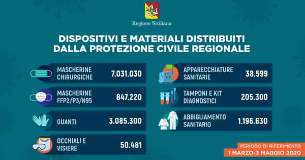 Prosegue la consegna, da parte della Protezione civile della presidenza della Regione Siciliana, di dispositivi di protezione individuale e materiale sanitario nelle nove province dell’Isola. A beneficiarne sono principalmente: strutture sanitarie, case di riposo per anziani, residenze sanitarie assistite, Comuni, Prefetture, Forze dell’Ordine, Esercito, ex Province, carceri, dipartimenti regionali, Confcommercio e Confesercenti. La merce distribuita proviene da acquisti diretti della Regione o della Protezione civile nazionale e da donazioni di soggetti privati.