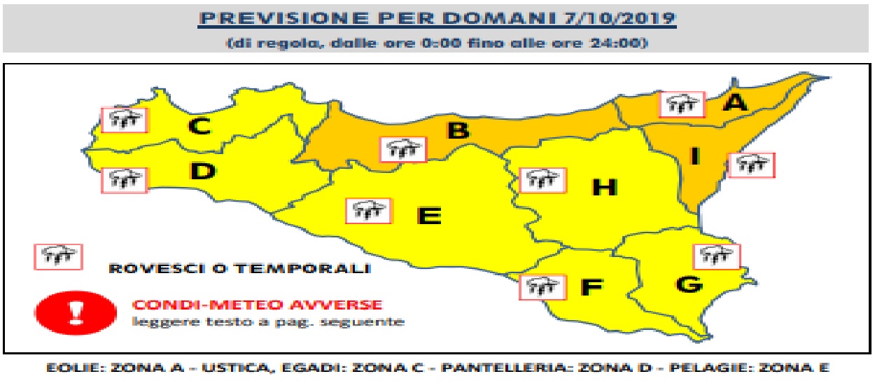 Infatti la SORIS (Sala Operativa Regionale Integrata Siciliana), facendo fede al Bollettino nazionale di vigilanza ha reso nota per domani l’esistenza di una moderata criticità in relazione al rischio meteo-idrogeologico e idraulico per il verificarsi di eventuali temporali che potrebbero essere associati a fenomeni di notevole intensità, locali grandinate, forti raffiche di vento e abituale attività elettrica. Ad iniziare da questa notte e per tutta la giornata di lunedì 7 ottobre, si prevede un peggioramento delle condizioni meteo.