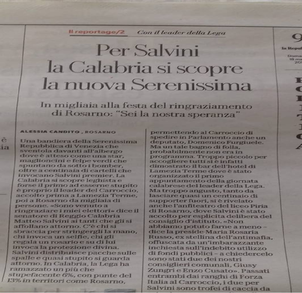 L’assessore all’Ambiente della Giunta Accorinti, Daniele Ialacqua, nel costatare un grande consenso di un Partito nordista, in un post su Facebook scrive: “su -La Repubblica- la cronaca della visita di Salvini in Calabria a Rosarno accolto come un liberatore”.