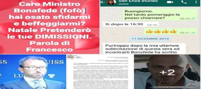 “Per tutta risposta, il ministro Bonafede, che non sa neanche cosa sia la disciplina e l’onore, dal suo pulpito, mi ha risposto con un post su Facebook (vedi foto sotto) e qui il post del ministro su Facebook https://www.facebook.com/603537412990402/posts/2931654356845351/ prendendosi gioco di me e di milioni di cittadini italiani che sono vittime di giudici e magistrati incompetenti e criminali al servizio di cosche o logge”.