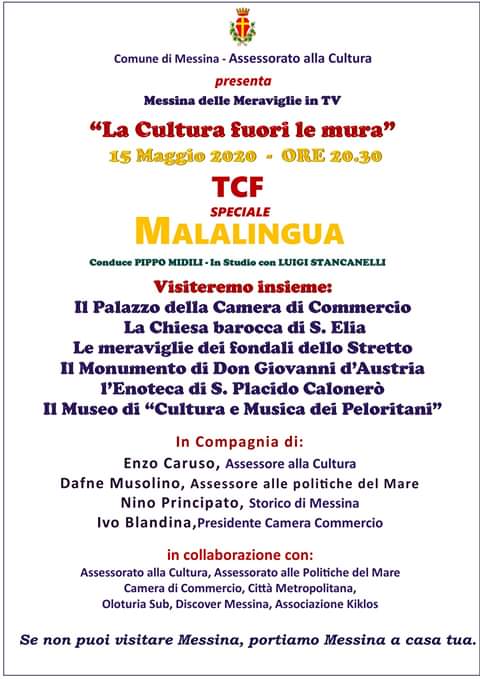 Una “Serata per la Cultura”, che consentirà di visitare Messina rimanendo comodamente seduti in poltrona insieme ai propri cari. L’iniziativa è stata promossa dall’Assessore Caruso grazie al positivo riscontro delle emittenti televisive cittadine, nell’ottica di un “servizio alla persona”, da offrire in questo particolare e triste momento, considerandola alla stregua di una particolare CURA che possa contribuire al benessere psichico dei messinesi, chiusi ormai da due mesi in casa. Domani sera sarà la volta di TCF a presentare una puntata speciale di “MALALINGUA”, condotta dal giornalista Pippo Midili e dedicata a “Messina delle Meraviglie. La Cultura fuori le Mura”.
