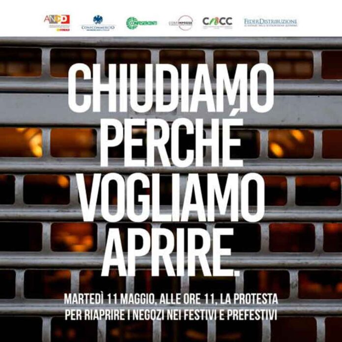 Domani, martedì 11 maggio p.v., alle 11.00, i punti vendita di tutti i centri commerciali d’Italia protesteranno pacificamente abbassando per alcuni minuti le saracinesche dei propri locali per chiedere l’immediata revoca delle misure restrittive che, da oltre sei mesi, impongono la chiusura nei giorni festivi e prefestivi dei negozi collocati al loro interno.