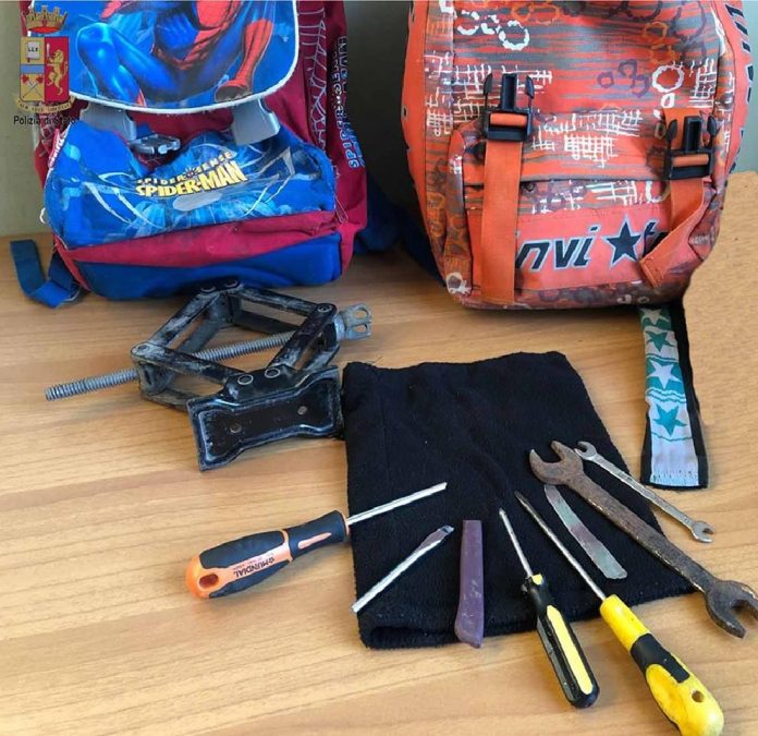 “All’interno dell’autovettura i poliziotti trovavano altro materiale atto allo scasso ed un ulteriore zaino. I due venivano pertanto condotti presso gli Uffici di Polizia dove confermavano ogni responsabilità, venivano tratti in arresto e su disposizione dell’Autorità Giudiziaria trattenuti presso le camere di sicurezza in attesa di essere giudicati con rito per direttissima”.