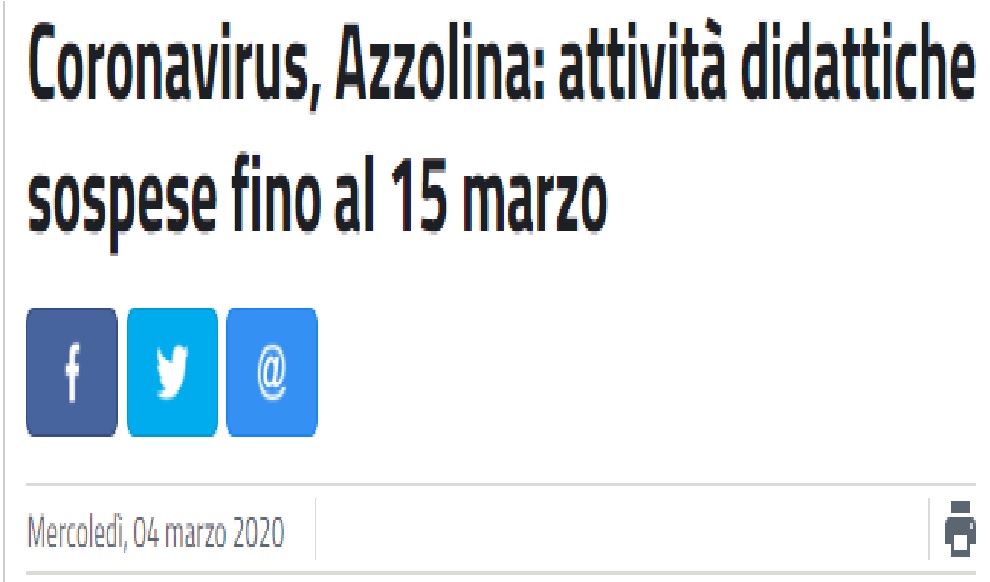 E’ ufficiale: scuole chiuse da domani fino al 15 marzo. “Per il governo non è stata una decisione semplice, abbiamo aspettato il parere del comitato tecnico scientifico e abbiamo deciso di sospendere le attività didattiche da domani al 15 marzo”, ha detto il ministro dell’Istruzione Lucia Azzolina parlando a Palazzo Chigi.