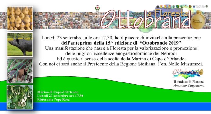 “Ho il piacere di invitarvi, lunedì 23 settembre, alle ore 17.30 alla marina d’Orlando (ristorante Pepe Rosa) alla presentazione dell’anteprima di Ottobrando 2019”. E’ questo il messaggio del sindaco Antonino Cappadona, in vista della prossima manifestazione che si terrà nella cittadina nebroidea.