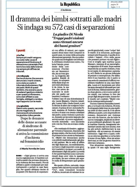 “Posso dire con certezza, dopo mesi e mesi di studio di casi analoghi a quelli della signora Massaro, -ogni giorno io e il mio team di consulenti legali riceviamo una media di sei segnalazioni al giorno di presunti allontanamenti ingiusti di bambini dalle madri-, che quando una donna ha un figlio con un uomo violento e sporge una denuncia per gli abusi subiti, si apre un percorso standard, una sorta di schema… denuncia, consulenza tecnica con accusa di alienazione parentale a carico della donna e successivo allontanamento del minore. Nel migliore dei casi il bambino viene collocato dai parenti, nel peggiore e molto più frequente del primo, viene -spedito- in casa famiglia per essere resettato affinché vengano ristabiliti i legami con il genitore, nel 95% il padre, violento o abusante”.