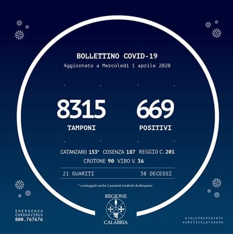 Nel conteggio sono compresi anche i due pazienti di Bergamo trasferiti a Catanzaro, mentre non sono compresi i numeri del contagio pervenuti dopo la comunicazione dei dati alla Protezione Civile Nazionale.
