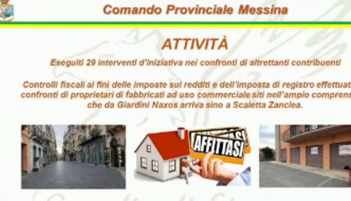 I finanzieri del Comando Provinciale di Messina, nell’ambito dell’azione a tutela delle entrate per il contrasto dell’evasione fiscale, a valle di un mirato piano di intensificazione dei controlli nell’area jonica della provincia peloritana, hanno scoperto l’evasione al Fisco di oltre 1 milione di euro, individuando ventinove proprietari che concedevano in locazione a terzi altrettanti immobili, senza correttamente dichiarare, in tutto o in parte, i relativi affitti percepiti.
