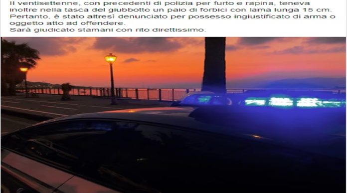 Il ventisettenne, con precedenti di Polizia per furto e rapina, teneva inoltre nella tasca del giubbotto un paio di forbici con lama lunga 15 cm. Pertanto, è stato altresì denunciato per possesso ingiustificato di arma o oggetto atto ad offendere. E’ stato giudicato stamani, con rito direttissimo.