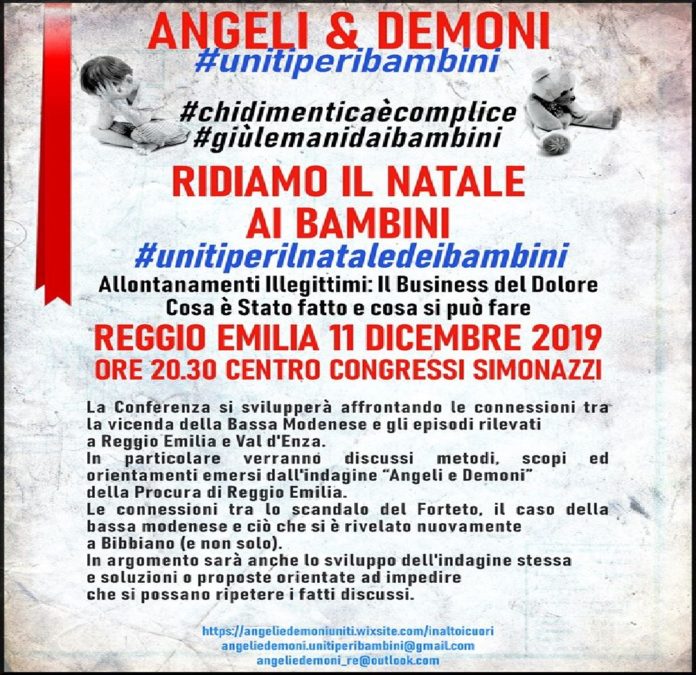 Il Comitato Angeli & Demoni #unitiperibambini è lieto di comunicare che in data 11 dicembre 2019 avrà luogo, presso il “Centro Congressi Simonazzi”, la conferenza “RIDIAMO IL NATALE AI BAMBINI”. Lo scrivono, da un sodalizio di persone formatosi a Reggio Emilia in seguito ai delicati fatti che sono accaduti la scorsa Estate, grazie ai quali si è scoperto in sistema illecito di affidi riguardanti i minorenni a Bibbiano.