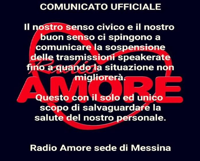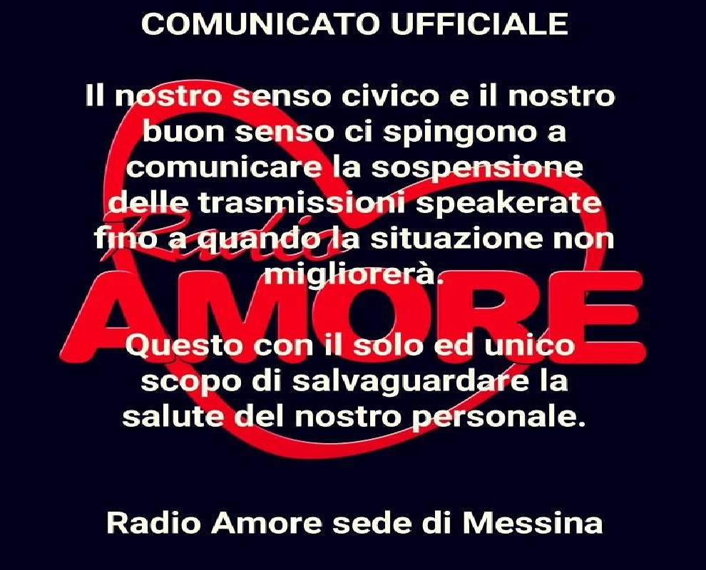 Segue, una nota ufficiale di Radio Amore Messina: “il nostro senso civico e il nostro buon senso ci spingono a comunicare la sospensione delle trasmissioni speakerate fino a quando la situazione non migliorerà. Questo, con il solo ed unico scopo, di salvaguardare la salute del nostro personale”.
