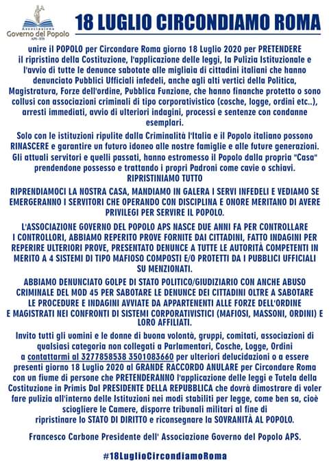 TUTTE LE NOVITÀ, SULLA MANIFESTAZIONE "ACCERCHIAMO ROMA" DEL 18 LUGLIO 2020, IDEATA DA FRANCESCO CARBONE PRESIDENTE DELLA A.P.S. GOVERNO DEL POPOLO COSTITUITA NEL 2018 A VILLAFRATI (PA)