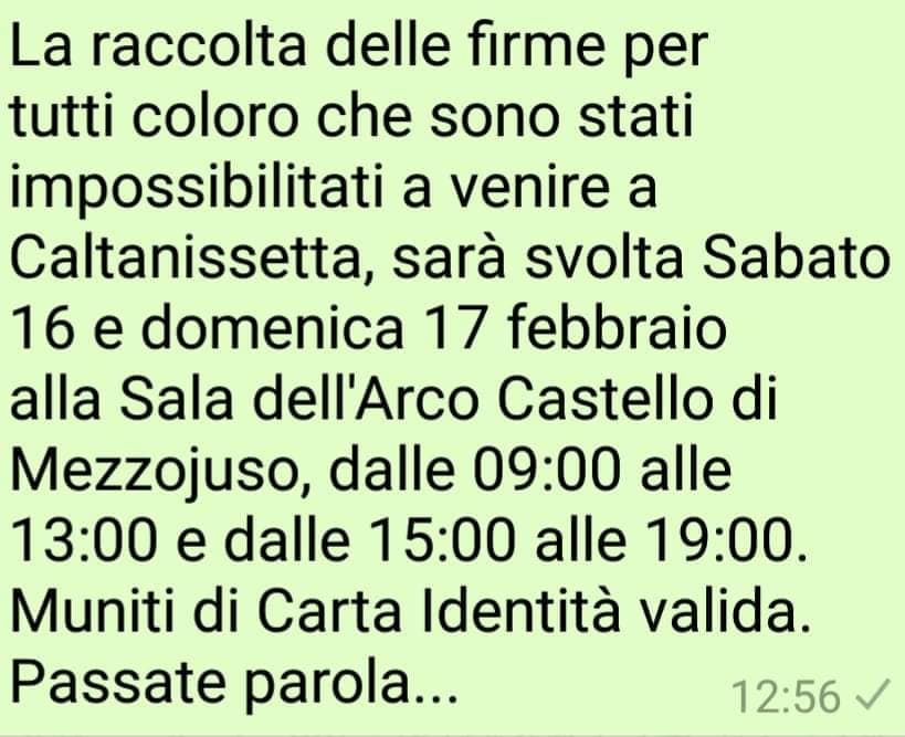 “Tutti i cittadini di Mezzojuso possono recarsi alla Sala Castello muniti di Carta di identità valida oggi 16 febbraio e domani 17 febbraio dalle 09:00 alle 13:00 e dalle 15:00 alle 19:00. Che trionfi la Giustizia e la Verità”.