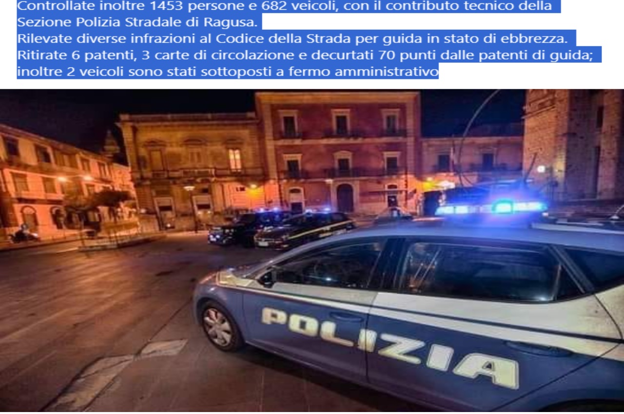 Controllate inoltre 1453 persone e 682 veicoli, con il contributo tecnico della Sezione Polizia Stradale di Ragusa. Rilevate diverse infrazioni al Codice della Strada per guida in stato di ebbrezza. Ritirate 6 patenti, 3 carte di circolazione e decurtati 70 punti dalle patenti di guida; inoltre 2 veicoli sono stati sottoposti a fermo amministrativo