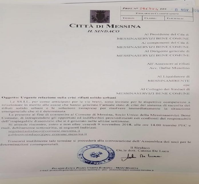 “La presente al fine di consentire al Comune di Messina, socio Unico della MessinaServizi Bene Comune di intraprendere gli opportuni ed indifferibili provvedimenti nei confronti dei responsabili dell’inspiegabile disservizio che si è generato nelle ultime settimane”.