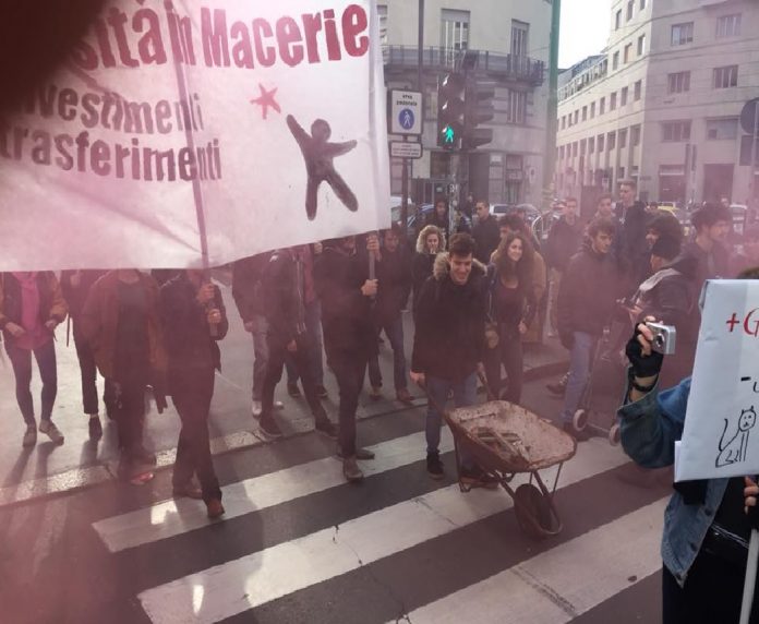 Ed ancora: “oggi, venerdì 16 novembre, in via Larga per la prima volta dopo tanto tempo gli universitari e gli studenti dell’Accademia di Brera si sono uniti al corteo degli studenti medi portando le macerie dell’Università in una carriola come simbolo di un continuo sotto-finanziamento. Dall’edilizia scolastica e universitaria sempre più precaria, al diritto allo studio negato fino ai posti a sedere nelle aule inesistenti, la formazione soffre sempre di più dei tagli che il governo da ormai più di 5 anni apporta. Queste sono le motivazioni che spingono ad una collaborazione e unione con gli studenti medi che come noi si trovano con strutture pericolanti e disfunzionali alle esigenze di spazio. Mentre ci vengono negati con la retorica della coperta corta interventi strutturali immediati per migliore le condizioni della didattica per chi vive oggi i luoghi della formazione, si vincolano invece enormi quantità di fondi per progetti che non vanno nell’interesse dell’Università e che saranno realizzati tra circa dieci anni, come il trasferimento della facoltà scientifiche dell’Università degli Studi di Milano in zona Expo”.