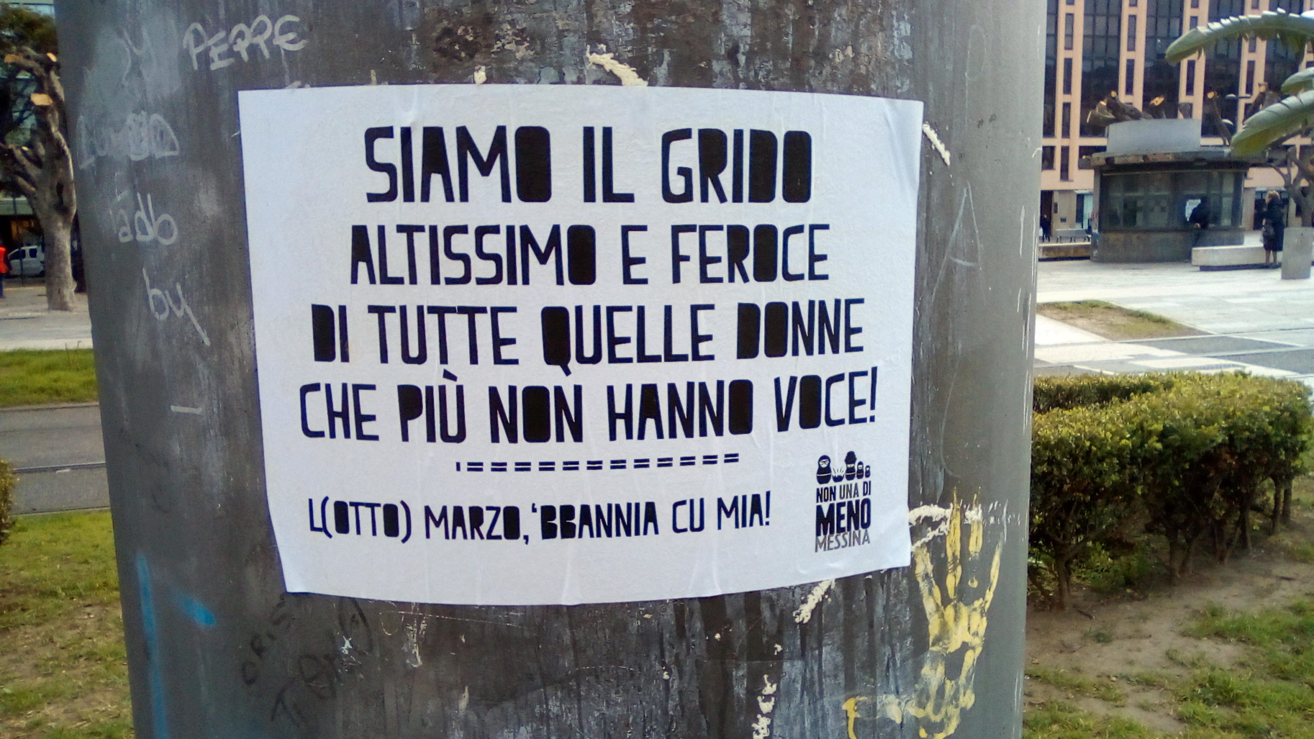 In attesa della giornata globale di mobilitazione femminista dell’8 marzo, durante la notte scorsa, in più punti della città di Messina sono stati affissi diversi manifesti contro la violenza sulle donne e l’oppressione di genere. “Non è gelosia, è patriarcato! L(otto) marzo scendi in piazza, ‘bbannia cu mia!” è uno dei messaggi che viene espresso. Un’azione simbolica e comunicativa che nasce dalla volontà di voler mettere sotto i riflettori dell’opinione pubblica il carattere patriarcale e sessista del sistema vigente, cosa troppo spesso sottaciuta e sottovalutata.