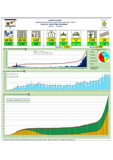 – Reggio Calabria: CASI ATTIVI 1.699 (65 in reparto; 2 in terapia intensiva; 1.632 in isolamento domiciliare); CASI CHIUSI 768 (741 guariti, 27 deceduti).