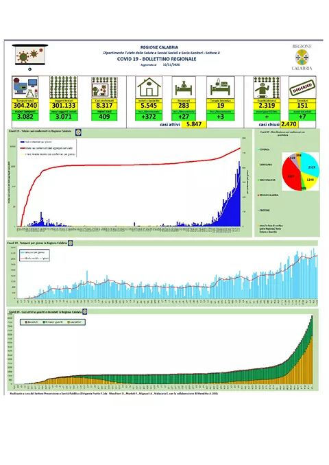 – Reggio Calabria: CASI ATTIVI 2.371 (81 in reparto; 5 in terapia intensiva; 2.285 in isolamento domiciliare); CASI CHIUSI 956 (920 guariti, 36 deceduti).