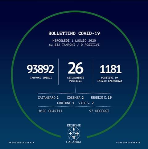 – Reggio Calabria: 2 in reparto; 17 in isolamento domiciliare; 255 guariti; 19 deceduti.