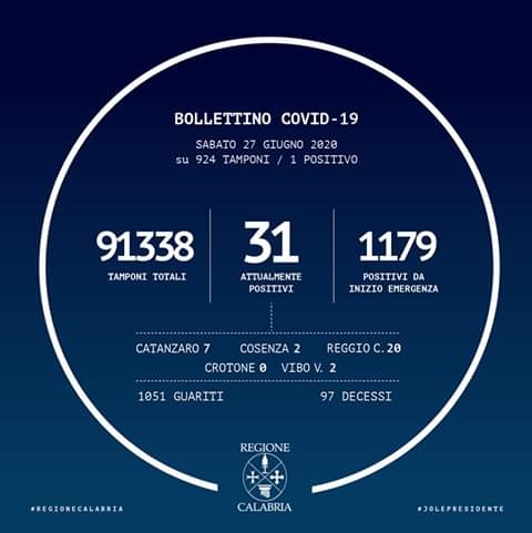 In Calabria ad oggi sono stati effettuati 91.338 tamponi. Le persone risultate positive al Coronavirus sono 1.179 (+1 rispetto a ieri), quelle negative sono 90.159.