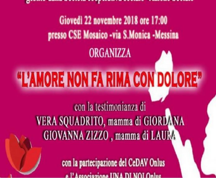 Per celebrare la Giornata internazionale contro la violenza sulle donne, con uno scopo preventivo ed informativo, si terrà presso il Centro Socio Educativo “Il Mosaico” sito al rione Santa Chiara di Giostra a Messina, gestito dalla Cooperativa Azione Sociale, l’incontro dal titolo “L’Amore non fa rima con dolore”.